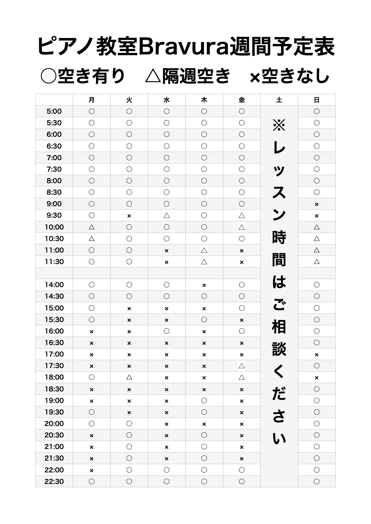 赤が休日、黄緑が1.3週、黒が2.4週レッスン日です
